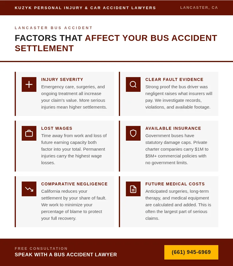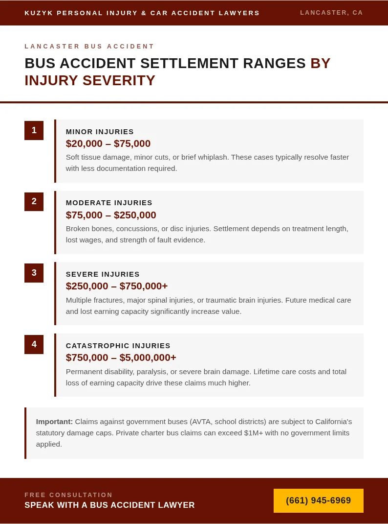 Average bus accident compensation in Lancaster ranges from $10,000 for minor injuries to over $2,000,000 for catastrophic harm. Settlement amounts depend on injury severity, available insurance coverage, and who operated the bus. Cases involving government-run transit lines face a $250,000 cap under California law, making early legal guidance critical to protecting your claim.