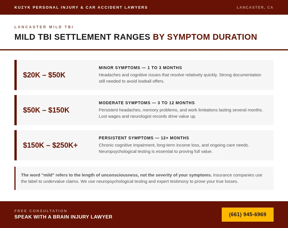 Mild traumatic brain injury settlements in Lancaster, CA typically range from tens of thousands to hundreds of thousands of dollars. Despite the label mild, these injuries cause chronic headaches, cognitive problems, and months of inability to work. The settlement value of your case depends on how thoroughly your symptoms are documented, what insurance coverage is available, and whether you have legal representation fighting for full compensation.