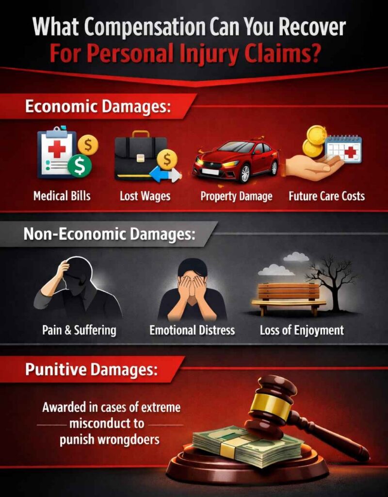 Non-economic damages address the personal impact of your injuries. Pain and suffering compensation recognizes the physical discomfort you endure. Emotional distress damages cover anxiety, depression, and other psychological effects. Loss of enjoyment damages compensate for activities you can no longer perform or enjoy.In cases involving extreme recklessness, such as drunk driving accidents, courts may award punitive damages. These additional funds punish the wrongdoer and deter similar behavior, though they are relatively rare in personal injury cases.